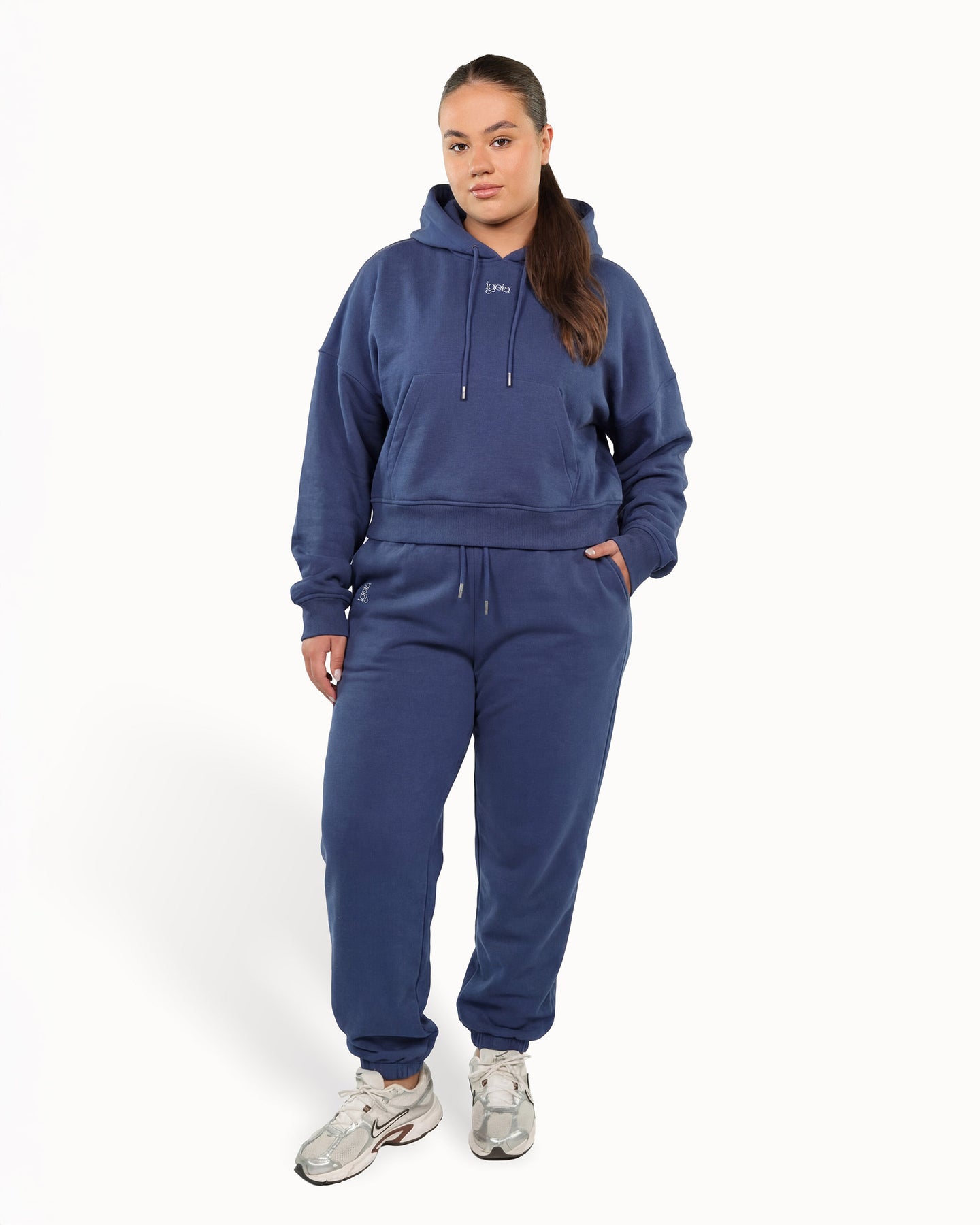 L'interno è felpato e super soffice al tatto. L'esterno è liscio e curato: tiene la forma, regge l'uscita, non sembra un capo da divano. Il logo igeia è ricamato direttamente sul tessuto, per una finitura duratura e premium.